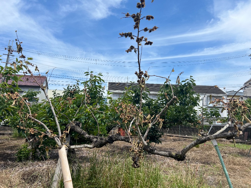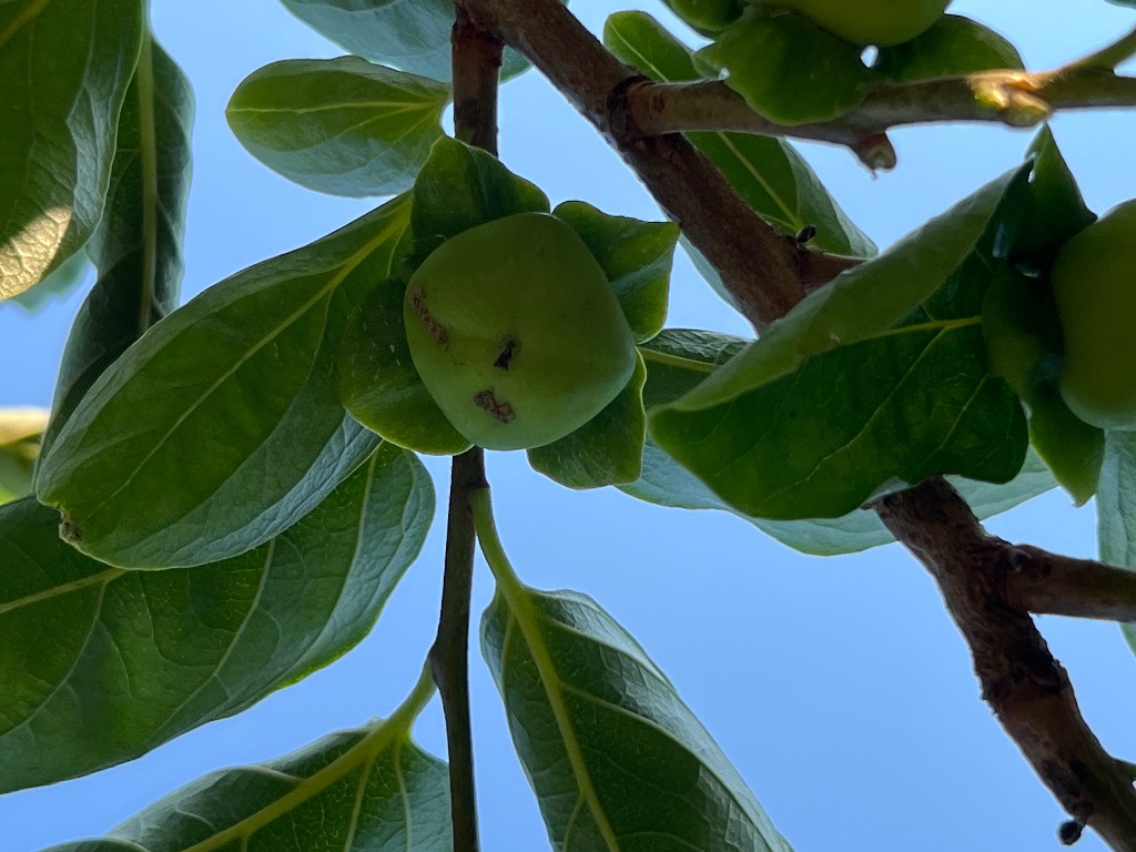 柿の摘果をしていると、カメムシにやられた実や傷が付いた実を今年はよく見かけます。